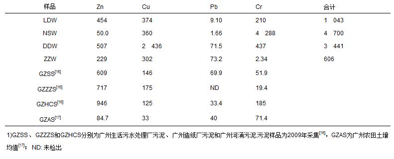 污泥樣品采自廣州4種不同類型的污水處理所產(chǎn)生的污泥,包括生活污水處理污泥(LDW)、 化工廢水處理污泥(NSW),電鍍廢水處理污泥(DDW)和造紙廢水處理污泥(ZZW),這些污泥目前處置方式除LDW做建筑材料外,其它污泥皆是填埋. 2012年兩次從污泥處置車間各采集脫水后濕污泥樣,混勻后用聚乙烯袋封口保存.形態(tài)和浸出毒性分析之前放在冰箱中4℃保存.取部分污泥樣品置于陰涼、 通風(fēng)處晾干,用玻璃棒壓散,于烘箱中(100 ± 5)℃干燥4 h后,用四分法多次篩選后取30 g污泥樣品,用瑪瑙研缽磨至樣品全部通過(guò)150 μm (100目)尼龍篩,裝入密封袋備用.