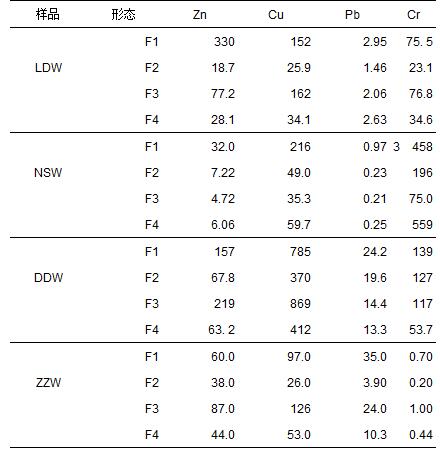據(jù)生物可利用態(tài)重金屬最大萃取量,LDW中Cu、 Cr和Zn生物可利用態(tài)分別為重金屬總量的28.1%、 4.8%和70.9%; NSW中Cu、 Cr和Zn生物可利用態(tài)分別為總量的65.5%、 86.0%和66.4%; DDW中Cu、 Cr、 Pb和Zn生物可利用態(tài)分別占總量的27.7%、 24.9%、 24.9%和29.8%; ZZW中Cu、 Pb和Zn分別占總量的33.1%、 46.0%和19.2%.總體而言,污泥酸性越強(qiáng),其中重金屬的生物可利用性越高,這與重金屬形態(tài)可遷移性一致.