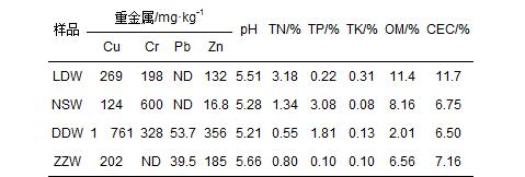 污泥樣品的理化性質(zhì)及含量見(jiàn)表2.除造紙廢水處理污泥外,其它脫水污泥含水率較高,達(dá)到75%以上.生活污水處理污泥(LDW)和化工廢水處理污泥(NSW)呈酸性,電鍍廢水處理污泥(DDW)和造紙廢水處理污泥(ZZW)呈堿性.不同類型污泥中成分含量差別較大,其中LDW中TN、 TK和OM含量較高,堿性污泥中TN和OM含量較低. NSW由于酸性較大造成陽(yáng)離子流失較多,其它污泥中陽(yáng)離子交換量皆高于10 cmol ·kg-1.