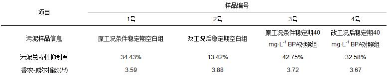 表 4 兩工況條件穩(wěn)定階段污泥樣品總毒性抑制率和香濃-威爾指數(shù)分析