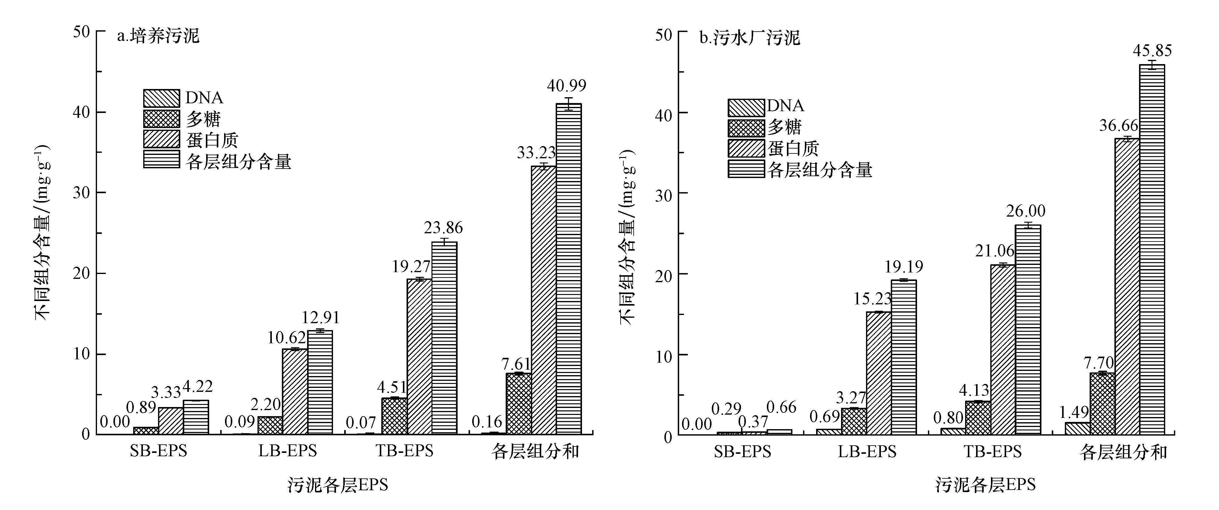 從EPS組成上看,EPS組分主要都是蛋白質(zhì),占總量的81.07%(培養(yǎng)污泥)、79.96%(污水廠污泥).其次為多糖,DNA含量最少.培養(yǎng)污泥、污水廠污泥EPS中蛋白質(zhì)與多糖含量的比值分別為4.37、4.76,說明培養(yǎng)污泥中多糖所占比重更大.這是由于培養(yǎng)污泥DO高,多糖產(chǎn)量會增加,但蛋白質(zhì)會保持不變.此外,培養(yǎng)污泥pH值(7.00~8.00)高于污水廠污泥(6.8~7.2),當pH值偏離中性時,雖然EPS含量有小幅度下降,但多糖含量有所增長.葛利云等試驗發(fā)現(xiàn),淀粉基質(zhì)培養(yǎng)的污泥比葡萄糖基質(zhì)培養(yǎng)的污泥EPS中蛋白質(zhì)與多糖的比值要高,本研究中培養(yǎng)污泥采用葡萄糖為碳源的人工配水,污水廠污泥的污水是市政污水,碳源成分復(fù)雜,因此本文的研究結(jié)果正好與這一結(jié)論相一致. 從不同層EPS組成變化上看,兩種污泥具有相似的規(guī)律.從不同層EPS組成上看,從SB層到TB層(由外到內(nèi)),EPS含量逐步增加.LB層中EPS含量占總量的31.56%(培養(yǎng)污泥)、41.86%(污水廠污泥),是SB層中的3.06倍(培養(yǎng)污泥)、29.08倍(污水廠污泥);TB層中EPS含量占總量的58.34%(培養(yǎng)污泥)、56.71%(污水廠污泥),是SB層中的5.65倍(培養(yǎng)污泥)、39.39倍(污水廠污泥).菌體分泌的EPS首先包裹在菌體細胞外表面,然后逐漸向外,填充到個體間隙中,當分泌量充滿污泥絮體內(nèi)部空隙時,新分泌出的EPS就會將原來積累的EPS擠到外層,這樣就使得外層的EPS就變得松散.最外層的EPS長期暴露于污水中,表面附著大量有機、無機污染物質(zhì),最終形成粘液層(SB-EPS).因此,菌體是先排出TB-EPS,之后慢慢演變成LB-EPS、SB-EPS,這樣就導(dǎo)致SB-EPS和LB-EPS含量相對固定,TB-EPS濃度不斷增加,只有當增加到一定程度時LB-EPS和SB-EPS才會增加.