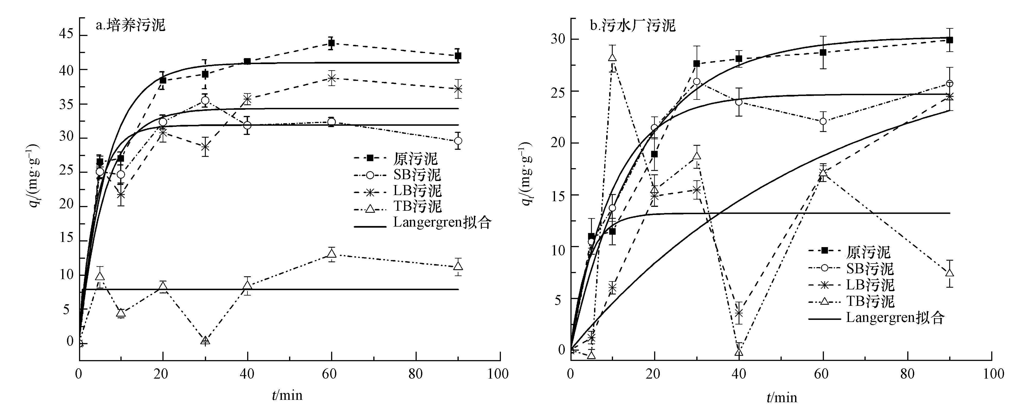 兩種污泥的原污泥、-SB污泥均與Lagergern單層吸附模型和Ritchie雙層吸附模型的擬合效果比較好(R2﹥0.90),這說明外層污泥在吸附過程中既存在單層的物理吸附過程,又存在多層的物理化學(xué)吸附過程.其中培養(yǎng)原污泥、培養(yǎng)-SB污泥吸附效果與Ritchie雙層吸附模型吻合性更好(R2﹥0.94),而污水廠原污泥、污水廠-SB污泥的吸附過程效果與Lagergern單層吸附模型吻合性更好(R2﹥0.96).-LB污泥與Lagergern單層吸附模型(R2為0.60~0.85)、Ritchie雙層吸附模型(R2為0.60~0.91)吻合度比-SB污泥小,吸附方式規(guī)律性不顯著.-TB污泥中的EPS已經(jīng)被比較完全地剝離,導(dǎo)致其對污水COD的吸附量明顯小于-SB污泥與-LB污泥,且波動大,與動力學(xué)模型吻合度均很小(R2﹤0.23),吸附方式無規(guī)律.可見,EPS剝離使得污泥對有機物COD的吸附方式發(fā)生變化.