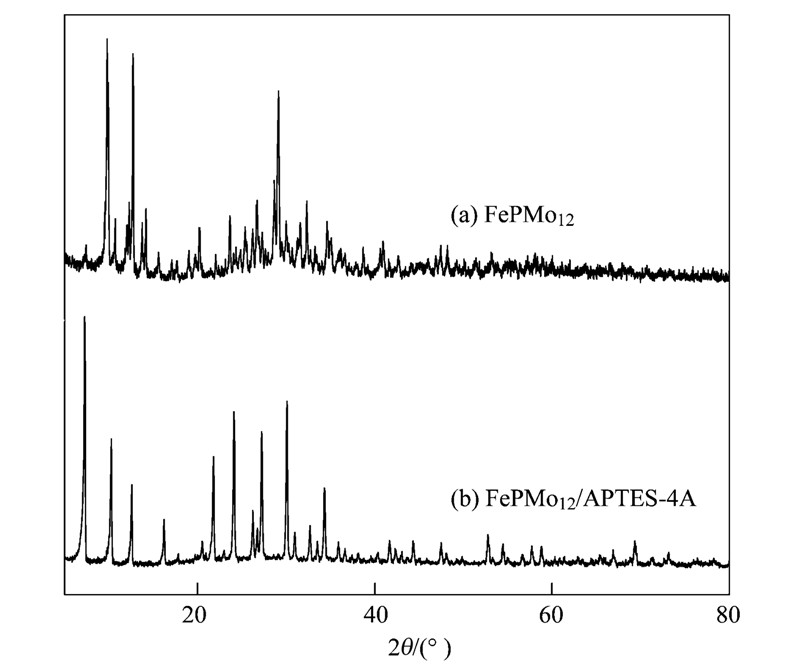 通過X-射線衍射可以定性地判斷雜多酸的結構類型. Keggin型雜多酸陰離子的3個特征峰出現在7°~10°、 16°~22°、 25°~30°范圍處. 圖 2(a)為空白樣品的X-射線衍射譜,圖 2(b)為FePMo12/APTES-4A的X-射線衍射譜. 分析可知,在9.7°、 20.3°、 29.0°處分別出現3個特征峰,恰符合Keggin結構特征衍射峰特性,因此負載后的雜多酸較好地保留了Keggin形態.