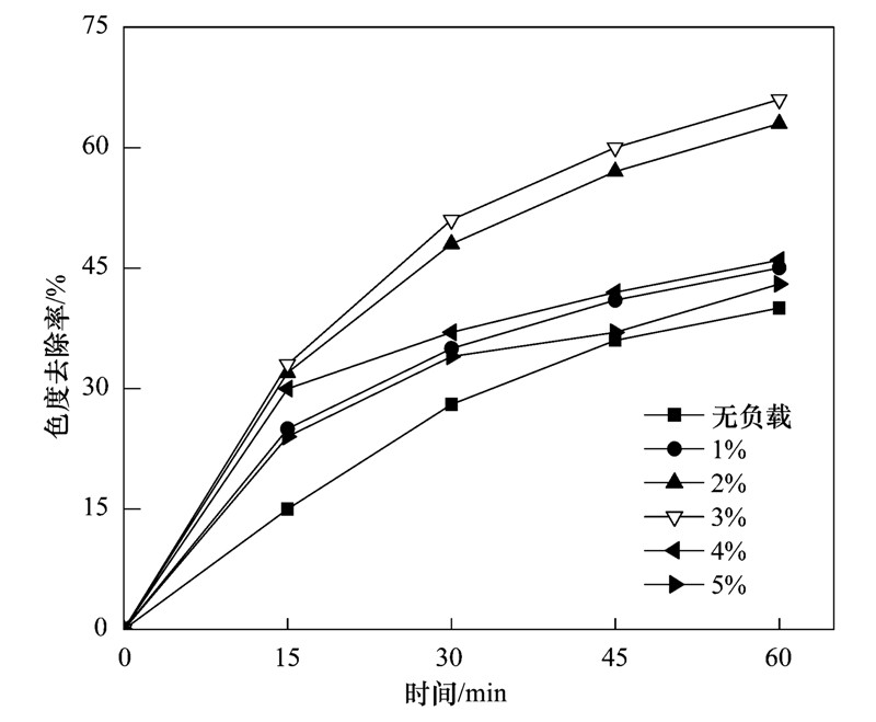 FePMo12負載量對電催化效果的影響如圖 3所示. 考察了電解時間為60 min時,活性組分負載量對脫色效果的影響. 從中可以看出無FePMo12負載時,色度去除率最低,說明活性組分FePMo12在電化學體系中起到了催化降解有機污染物的作用. 負載量為3%的催化劑,色度去除率最高. 負載量較低的時候,催化劑的活性組分較少,催化性能較弱; 當負載量超過3%時,影響FePMo12在4A內的分散度,降低催化活性[10]. 因此,選擇活性組分負載量為3%的催化劑進行實驗.