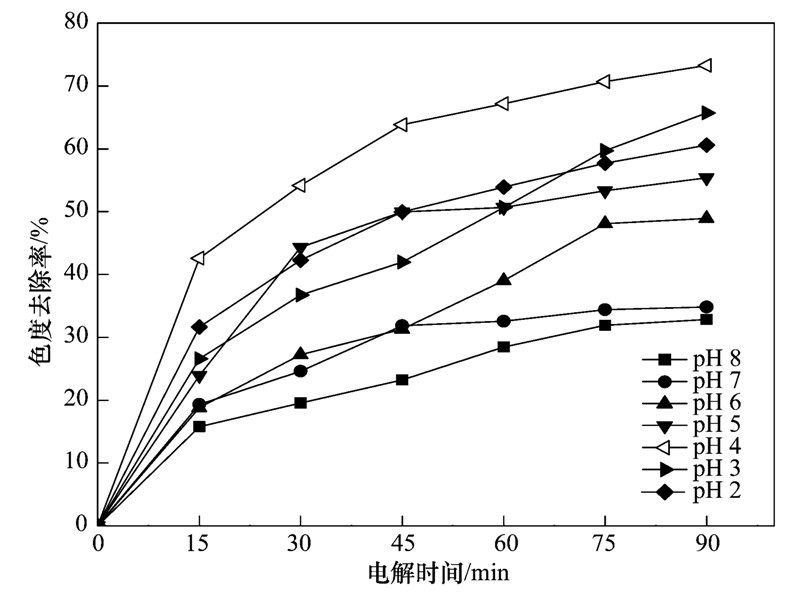 體系中pH值是影響電催化效果的重要因素之一,溶液pH值的改變將使電極表面的電荷以及氧化還原電位發生變化. 初始pH值對電催化效果的影響如圖 6所示. 酸性條件下的脫色率優于堿性條件. 當染料廢水的初始pH值為4時,色度去除率達到最大值. 多金屬氧酸鹽在不同pH的溶液中,能逐級分解成為一個或多個電子受體的雜多藍,不同結構的雜多藍對有機物的去除率效果不同. 當體系處于中性和堿性條件下,脫色效果不顯著,這是因為Keggin型雜多藍在溶液中沒有發生質子化. PMo12O3-40的還原電位依賴pH值,隨著pH的降低氧化還原電位正移,當pH值為4時,此時PMo12O3-40的雜多藍發生高效的氧化還原反應,使得色度去除率達到最大值. 在酸性條件下,Fe3+亦可能發生類Fenton反應,提高脫色效果. 但是在強酸下電極基體很容易鈍化,從而使其催化性能下降,影響陽極電極的壽命[14,15]. 所以,確定最適pH值為4.