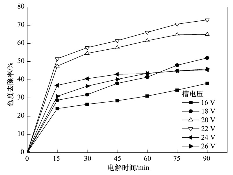 圖 5 槽電壓對體系色度去除率的影響
