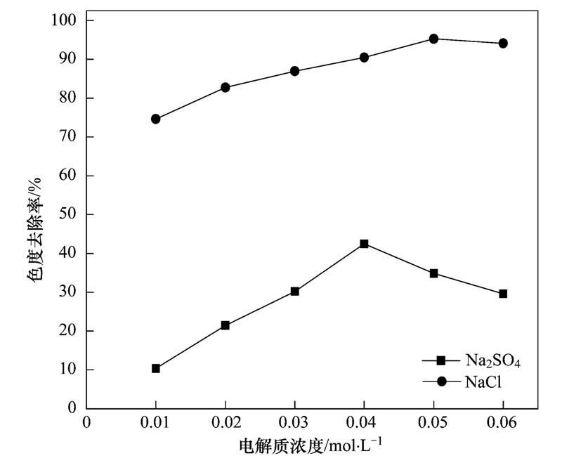 電化學體系中加入支持電解質可以提高溶液的導電性,促進電子的轉移,進而提高色度去除率[20, 21, 22]. 圖 9為不同支持電解質濃度對酸性大紅3R染料電催化效果的影響. 從中可以看出,色度去除率隨著兩種支持電解質NaCl和Na2SO4濃度的增大而先提高后降低. 當NaCl為支持電解質,NaCl濃度從0.01mol ·L-1增加到0.04mol ·L-1時,色度去除率從74.6%增加到90.5%. 當NaCl濃度為0.05mol ·L-1時,色度去除率達到最大為95.3%; 當NaCl濃度大于0.05mol ·L-1時,色度去除率出現下降趨勢. 在Na2SO4為支持電解質時,Na2SO4濃度為0.04mol ·L-1時色度去除率達到最大為42.5%,當Na2SO4濃度大于0.04mol ·L-1時,色度去除率出現下降趨勢.
