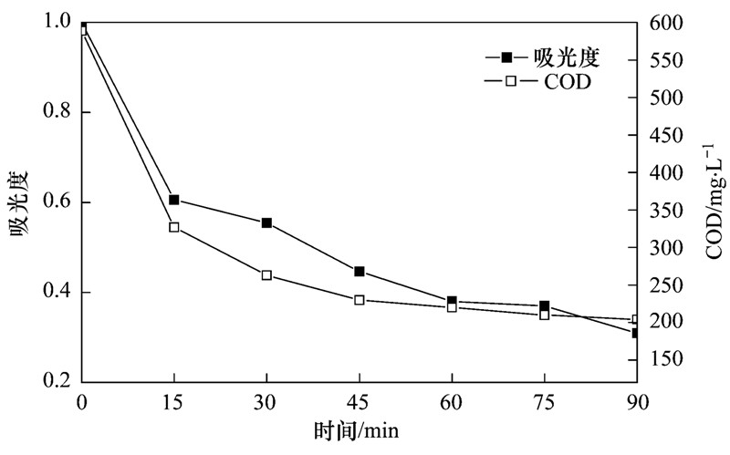在最優條件下考察電化學氧化體系對水樣COD的降解效果. 圖 10為不同時間507 nm下吸光度和COD降解曲線. 從中可以看出,當DC達到75.3%時,COD從589 mg ·L-1降至204 mg ·L-1,90 min時去除率達到65.4%. 表明隨著氧化還原反應的不斷進行,酸性大紅3R逐漸被降解.