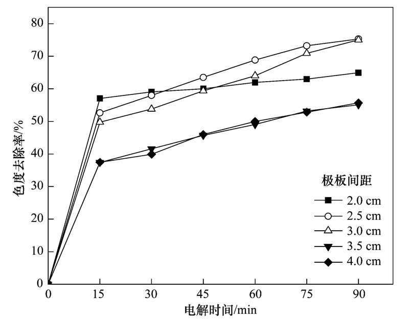 極板間距對電催化效果的影響如圖 8所示. 當極板間距從2.0 cm增加到3.0 cm時,色度去除率升高,當極板間距為3.0 cm時,色度去除率達到最大值75.3%. 當極板間距增加到3.5 cm和4.0 cm時,色度去除率則出現下降現象. 極板間距過大,反應體系的電阻隨之增大,隨著極板間距減小,相應縮短了對流、 擴散傳質的距離,增大了傳質的濃度梯度,強化了傳質效果. 但間距過小會使體系溫度過高,加劇副反應[18,19]. 因此,選擇最適的極板間距為3.0 cm.
