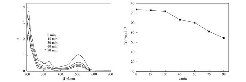 (2)FePMo12/APTES-4A催化劑對酸性大紅3R模擬廢水有良好的脫色效果,催化粒子填充量為50 g,負載量為3%,電解時間為90 min時,在pH為4,槽電壓為22 V,曝氣量為0.08 m3 ·h-1,極板間距3.0 cm反應條件下,90 min后脫色率達到75.3%,COD和TOC去除率分別達到65.4%和46.0%. 并通過可見-紫外光譜對酸性大紅3R的中間產物分析,降解90 min后顯色基團已基本被破壞.