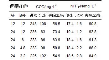 厭氧濾池和曝氣生物濾池水力停留時間對COD和NH+4-N的去除率見表 2所示. 在系統(tǒng)穩(wěn)定運行過程中,改變厭氧濾池的停留時間對系統(tǒng)最終出水COD影響較大. 保持BAF水力停留時間為12 h的前提下,AF停留時間從24 h下降至12 h時,系統(tǒng)對COD的去除效率從73.4%下降至56.5%. 由此可見,延長厭氧停留時間可以有效提高廢水的可生化性,提高系統(tǒng)的處理效率.