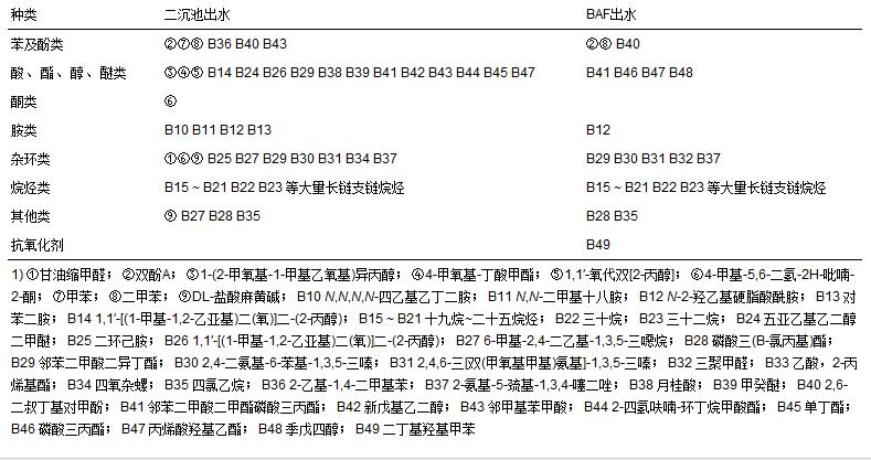 (2)化工園區(qū)廢水處理出水的GC-MS測試中檢測出大量有機物,經(jīng)AF+BAF處理后出水可檢測出的典型有機物種類大幅減少. 廢水中的大分子飽和烷烴和含氮雜環(huán)類物質(zhì)去除效率不佳.