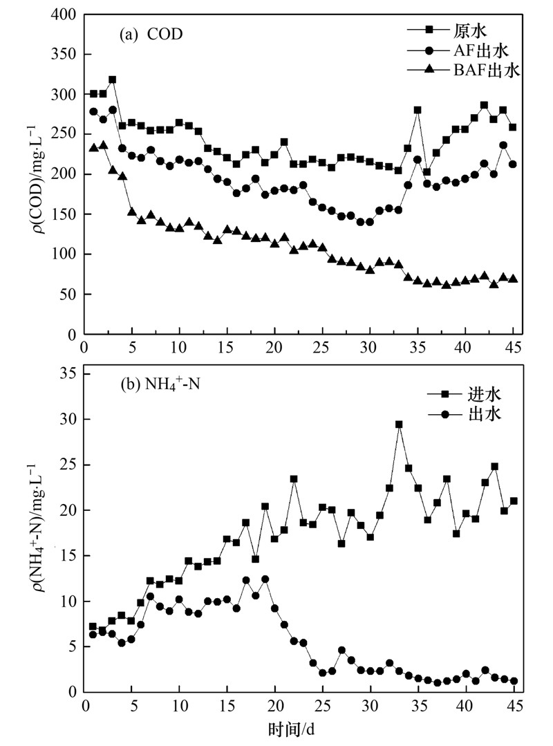 圖 3 AF+BAF啟動期間對COD和NH+4-N的去除效果