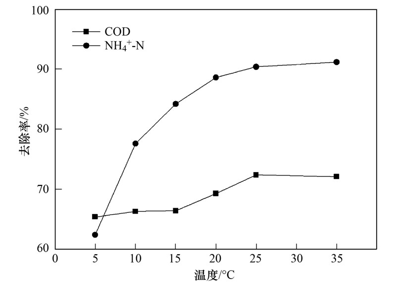 對于廢水的生物處理過程,溫度是一個非常重要的影響因素,它直接影響微生物的活性. 如圖 4所示,當(dāng)溫度維持在25℃以上時,系統(tǒng)對COD的去除效率可保持在74%以上. 隨著溫度的降低,COD的去除效率雖有所下降,但下降幅度不大,當(dāng)溫度下降至5℃時,COD的去除效率為65.4%. 由此可見,AF+BAF工藝對溫度的變化具有較強的適應(yīng)能力,即使在冬季條件下運行,系統(tǒng)對COD的去除仍可保持較高的效率. 溫度變化對氨氮的影響較為明顯,當(dāng)溫度從35℃下降至5℃時,氨氮的去除效率從91.2%下降至62.4%,這與硝化細菌在低溫下活性下降有關(guān).