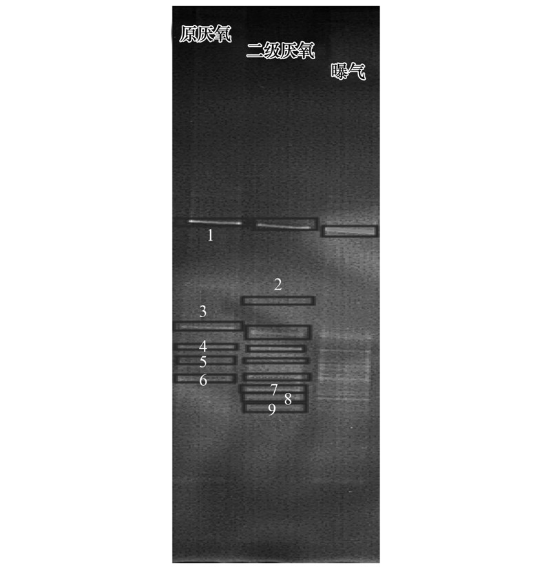 由圖 7可以看出,厭氧濾池污泥樣品比原廢水廠UASB池污泥樣品條帶多,其微生物多樣性復(fù)雜. 進水水質(zhì)的差異能影響厭氧污泥中微生物的種群結(jié)構(gòu). 通過DGGE圖譜可以半定量分析圖譜中不同細菌種群的相對含量[27]. 厭氧濾池中菌群的相對種類有明顯增加(條帶2、 7、 8、 9),有一些菌群(條帶1、 3、 4、 5、 6)的量無明顯變化. 曝氣生物濾池中主要為好氧微生物,與厭氧濾池的菌種存在本質(zhì)差別.