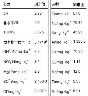 所采集土壤樣品的部分物理化學參數見表 1. 樣品酸性很強,pHKCl僅為2.83. 總有機碳含量為0.675%,低于農田和森林土壤TOC平均含量[23,24]; 含水率為9.5%; 土壤微生物豐度為3.1×108 個 ·g-1; NH+4-N和NO-3-N含量分別為7.6 mg ·kg-1、 3.1 mg ·kg-1. 經測得樣品中有效金屬含量很高,其中Al含量最高達1 380.3 mg ·kg-1,Fe含量高達57.0 mg ·kg-1. SO2-4含量高達2 168.0 mg ·kg-1.