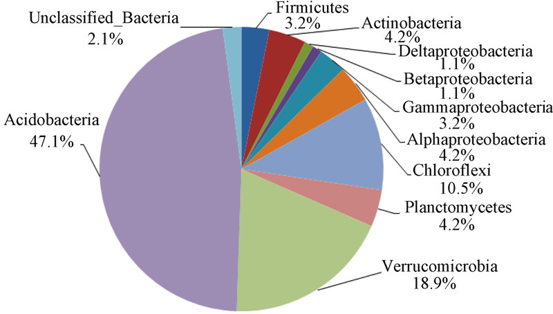 將每種基因型的序列輸入RDP網站,得到該基因型所屬的系統發育類群. 結果顯示,細菌文庫中包含了11個類群(如圖 2),其中所占比例最大的3個類群分別為Acidobacteria(47.4%)、 Verrucomicrobia(18.9%)、 Chloroflexi(10.5%).