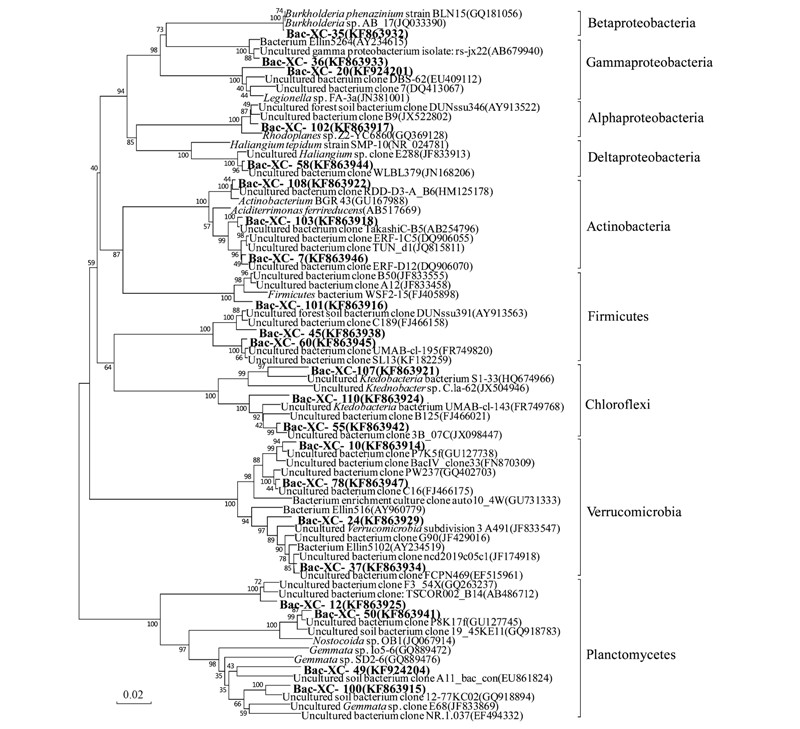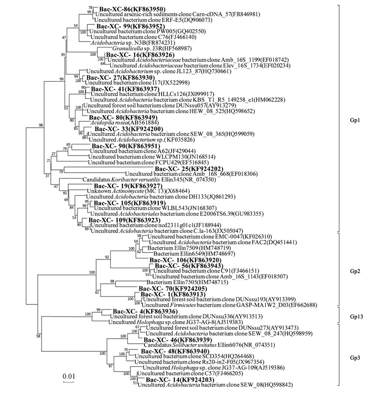 克隆Bac-XC-105(2.0%)、 Bac-XC-109(5.1%)、 Bac-XC-19(1.0%)和Bac-XC-25(1.0%)均與Candidatus Koribacter versatilis 的親緣關系較近. Ward等[31]比較了包括Candidatus Koribacter versatilis在內的酸桿菌門中3個種的全基因組,發現Candidatus Koribacter versatilis具備硝酸鹽和亞硝酸鹽還原能力,且適宜在pH 4.0~6.5的環境中生存.