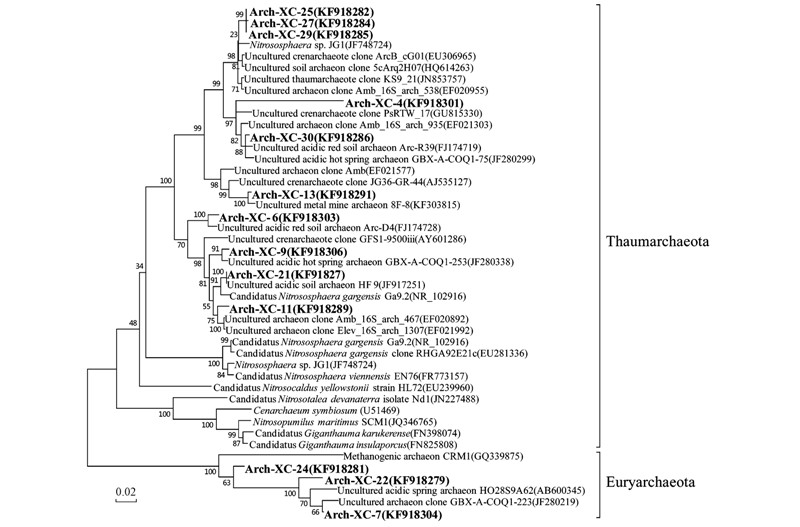 奇古菌門中比例最高也是文庫中豐度最大的基因型為Arch-XC-25,所占比例為27.6%. 在GenBank數據庫的比對結果中,與該克隆親緣關系較近的均為未培養菌株(如圖 5),多數檢測自土壤和沉積物中; 其中相似度為99%的一個序列分離自美國橡樹嶺Melton河支流流域沿岸pH為4.5的土壤樣品. 克隆Arc-XC-13在文庫中豐度為13.8%,與該克隆親緣關系最近的克隆來自金屬礦區(如鈾尾礦)和酸性泉水. 基因型Arc-XC-11和Arc-XC-27各包含兩個克隆(豐度為6.9%),其余基因型均為單克隆. 與這些基因型相似的序列多分離自酸性紅壤、 酸性礦山廢水、 酸性溫泉以及植物根際土壤等. 在GenBank數據庫中與本研究中所有古菌基因型相似度在93%以上的都為未得到純培養的古菌的16S rDNA序列. 而去除未培養古菌的序列后,本研究中所有古菌的序列類型都與Nitrososphaera(亞硝化球菌屬)親緣關系最近,相似度為81%~87%. Nitrososphaera 屬的Nitrososphaera viennensis EN76(維也納亞硝化球菌)是第一株分離自土壤環境的氨氧化古菌[41]; Nitrososphaera gargensis(加爾加亞硝化球菌)分離自俄羅斯加爾加地區的一個溫泉,具有氧化氨的能力,但是氨濃度超過3 mmol ·L-1會抑制其生長[42]. 分離自英格蘭酸性土壤(pH 4.5)的Nitrosotalea devanaterra(阿伯丁土壤亞硝化細桿菌)是1株嗜酸氨氧化古菌,pH 4~5時均生長良好,當pH>5.5時生長會受到抑制; 最適生長溫度為25℃[43]. 已有研究表明,在酸性土壤中,AOA與硝化潛勢存在明顯正相關關系,主導氨氧化過程的發生[43]. 本研究土壤也具有類似特點,氨氧化過程可能主要由氨氧化古菌驅動.
