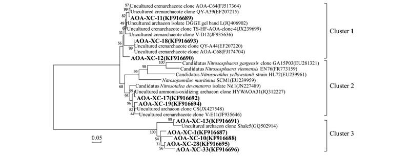由古菌文庫組成可知本樣品中大多數古菌與氨氧化功能相關,故利用古菌特異性氨單加氧酶引物對AF和AR擴增氨單加氧酶基因序列,共得到39條有效基因序列. 經與GenBank數據庫中已有序列比對,發現該土壤樣品中多數氨氧化古菌的最相似序列來自酸性紅壤、 酸性土壤和酸性礦山等與本樣品所取條件相似的環境中,其中多數與已知菌種的相似性都低于90%,基因型AOA-XC-17和AOA-XC-19與Nitrosotalea devanaterra(阿伯丁土壤亞硝化細桿菌)的相似性都為94%. 從氨氧化古菌的系統發育樹(圖 6)可看出,Cluster 3中的基因型AOA-XC-1(文庫中豐度為5.1%),AOA-XC-10(12.8%),AOA-XC-13(10.3%),AOA-XC-28(2.6%),AOA-XC-33(2.6%)與數據庫中的氨氧化古菌序列相似性都較低,與已得到純培養的氨氧化古菌(全部位于Cluster 2中)親緣關系較遠,證明該土壤樣品中存在AOA新類群.