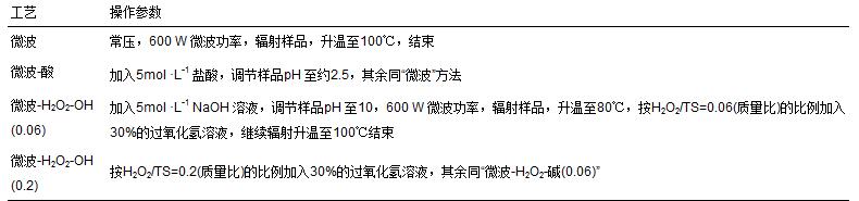 試驗(yàn)采用的微波設(shè)備為自主研制的微波反應(yīng)器(JWFY-1T,定制于巨龍微波能設(shè)備公司),頻率為2450 MHz,磁控管最大輸出功率和溫度分別為1 kW,100℃. 反應(yīng)容器為容積2 L的塑料容器,容器上部敞開,配備了攪拌槳均質(zhì)和熱電偶溫度傳感器實(shí)時(shí)監(jiān)測溫度. 1.2 試驗(yàn)方法