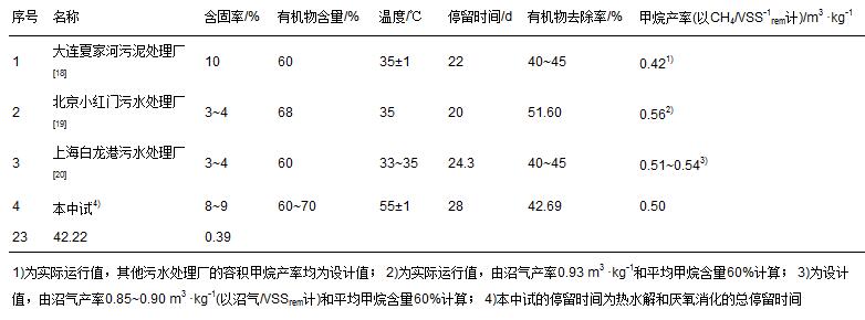 截止目前,我國建成并運行良好的污泥厭氧消化設施主要有大連東泰夏家河污泥處理廠、 北京小紅門污水處理廠污泥消化工程、 青島麥島污水處理廠污泥消化工程、 上海白龍港污水處理廠污泥處理處置工程和鄭州王新莊污水處理廠污泥消化工程等. 本中試的試驗結果與國內運行良好的部分實際工程運行對比結果見表 1.