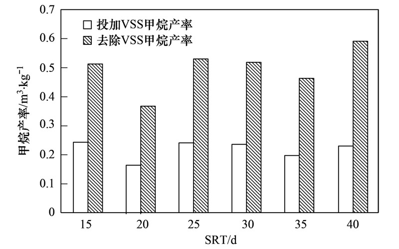 甲烷產率是評價厭氧消化回收能源的重要指標. 由圖 4可知,當SRT為25~40 d時,甲烷產率(以CH4/VSSadd計)變化不大,為0.20~0.24 m3 ·kg-1; 當SRT為15 d、 20 d時,甲烷產率下降,為0.12 m3 ·kg-1、 0.17 m3 ·kg-1. 這表明當SRT在20 d以下時,污泥有機物的消化還不夠徹底. 綜合甲烷產率以及前文的有機物去除率等結果,在實際工程中,本工藝的高溫厭氧消化的SRT可取25 d.