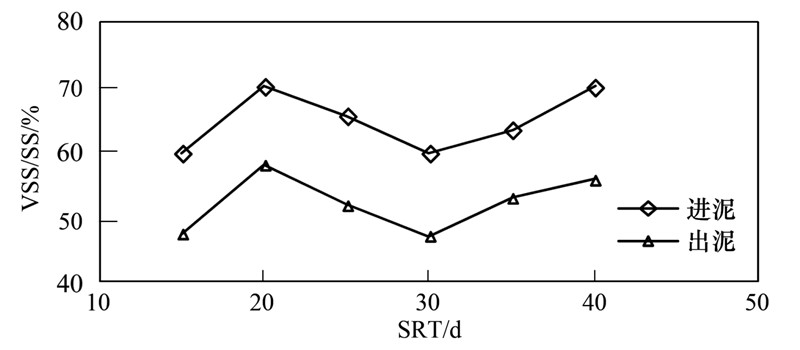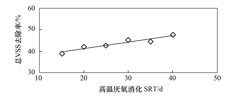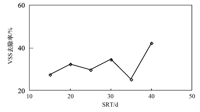 當高溫厭氧消化的SRT為15 d、 20 d、 25 d、 30 d、 35 d和40 d時,VSS去除率分別為27.5%、 32.5%、 29.8%、 34.6%、 25.3%和42.3%,有機負荷(以VSS計)分別為3.16、 2.36、 1.84、 1.58、 1.15、 1.18 kg ·(m3 ·d)-1. SRT為35 d時,去除率較低. 在這期間,污水廠的剩余污泥的VSS/SS由70%左右下降至50%左右. 污泥性質不穩定可能是去除率較低的主要原因.