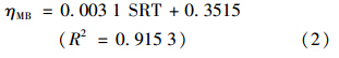 工藝的總VSS去除率見圖 5. 從中可知,當高溫厭氧消化的SRT為15 d、 20 d、 25 d、 30 d、 35 d和40 d時,總VSS去除率分別為39.07%、 42.22%、 42.69%、 45.31%、 44.70%和47.87%,總去除率(ηMB)與SRT線性正相關(式2),相關系數達到0.9153. 厭氧消化的SRT在20 d以上時,總VSS去除率在40%以上,完全滿足《城鎮污水處理廠污染物排放標準(GB 18918-2002)》中污泥穩定的要求.