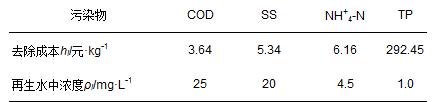 ②環境改善效益. 當地環境改善的收益從兩方面獲得,一方面阻止了污水排放造成的環境污染,另一方面由于使用再生水增加了綠化覆蓋面,補給了人工池塘、 湖泊,改善了當地居民生存環境. 分別計算這兩方面收益非常困難,可以作為一個整體收益考慮,等價于再生水中污染物沒有進入收集處理系統,直接排放造成環境污染,要去除這些污染物的花費[14]. 通過機會成本法[15],這部分收益可用式(3)表示: