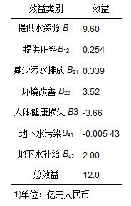 北京地區大部分是不透水層,補給條件不太理想,水下移很少見. 北京供水重要來源的永定河沿西北地質斷層線流動,是北京盆地地下水主要的補給區. 據統計資料每年有1.2億m3的再生水供給永定河[27],其中地下水補給量大約為1.0億m3[28],則每年向地下補給水量為1億m3,地下水使用的平均收費為2元 ·m-3,故地下水補給的效益為2億元.