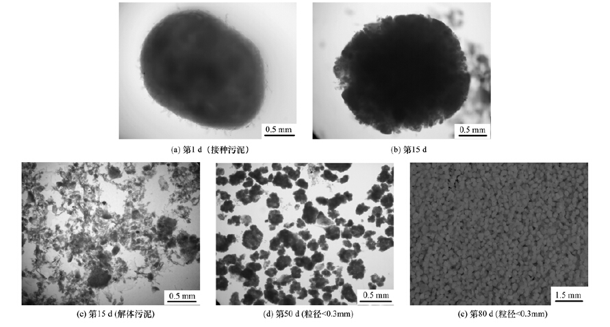 污泥形態(tài)通過OLYMPUS CX41型顯微鏡及數碼相機觀察,顆粒污泥粒徑分布采用篩分法; 從反應器中隨機取出一定量污泥,清洗后分別通過孔徑為2.5、 1.6、 0.8、 0. 3、 0.15 mm的分樣篩,測量留在篩網上的顆粒質量,然后將各部分相加得到污泥總重,最終確定每一部分所占質量分數.