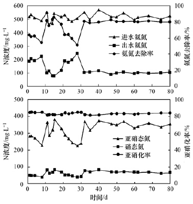 反應器構型的改變不但致使顆粒污泥的理化特性發(fā)生顯著變化,而且還對污泥的硝化性能具有一定影響. 圖 7所示為亞硝化顆粒污泥接種至CSTR后的整體運行狀況,從中可以看出,在CSTR運行前期(前一個月)NH+4-N去除效果呈現較大波動,出水中NO-2-N和NO-3-N濃度亦隨之變化難穩(wěn). 研究證實與絮體污泥不同,成熟的硝化顆粒污泥一般具有獨特的微生物種群分布規(guī)律[31,32],然而,反應器構型的變化引起部分顆粒污泥的解體,其微生物種群的分布規(guī)律也隨之被打破,絮體污泥在不斷產生的同時亦隨出水不斷流失(圖 4),加之反應器中蘊含的絮體污泥的顆粒化過程,因此,在上述各過程達到動態(tài)平衡之前硝化反應亦難以穩(wěn)定. 當CSTR運行至約30 d時,出水中NH+4-N、 NO-2-N和NO-3-N開始趨于穩(wěn)定,并在隨后的運行中一直保持. 正如2.1節(jié)中所述,在CSTR運行的中后期反應器中污泥的形態(tài)與運行前期顯著不同,較大粒徑顆粒污泥的沉降性能逐漸改善(圖 5),粒徑<0.3 mm的部分逐漸實現顆粒化[圖 3(d)和3(e)],且出水SS也趨于穩(wěn)定(圖 4),說明反應器中微生物逐漸構建了新的微生態(tài)平衡系統(tǒng),保證了CSTR穩(wěn)定的硝化性能.