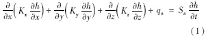式中,Kx、 Ky、 Kz分別為滲透系數在x、 x、 y方向的分量; h表示水頭(m); qs表示單位時間從單位體積含水層流入或流出的水量(d-1); Ss表示貯水率(m-1); t表示時間(d). MT3DMS地下水溶質運移方程: