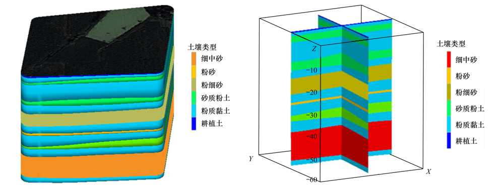 依據場地調查資料,利用CTECH對研究區構建三維地質剖面圖,第一層主要含水層為非承壓含水層,地下水標高16~23 m,厚度約6.92 m,以粉細砂為主,局部夾有砂質粉土、 黏質粉土和粉質黏土(圖 2). 研究區第一含水層下面主要為砂質粉土、 黏質粉土,滲透性很差,能夠起到較好的隔水作用.