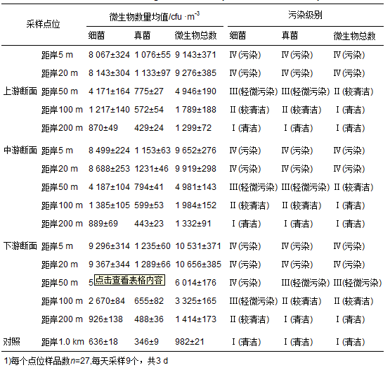 細菌、 真菌及微生物總數監測結果如表 1所示,在上游、 中游、 下游這3個斷面15個采樣點中,細菌超標率為66.7%,其中輕微污染點位占30%,污染級別點位占70%; 真菌超標率為60%,其中輕微污染點位占33.3%,污染級別點位占66.7%; 微生物總數超標率46.7%,其中輕微污染點位占14.3%,污染級別點位占85.7%. 在45個污染分級結果中,有7個污染級別為Ⅲ級,占總數15.6%,19個污染級別為Ⅳ,占總數42.2%. 綜上可知,在城市黑臭水體周邊空氣中細菌和真菌超標率較高,微生物總數污染程度相對較低,整體污染水平以Ⅳ級污染為主.