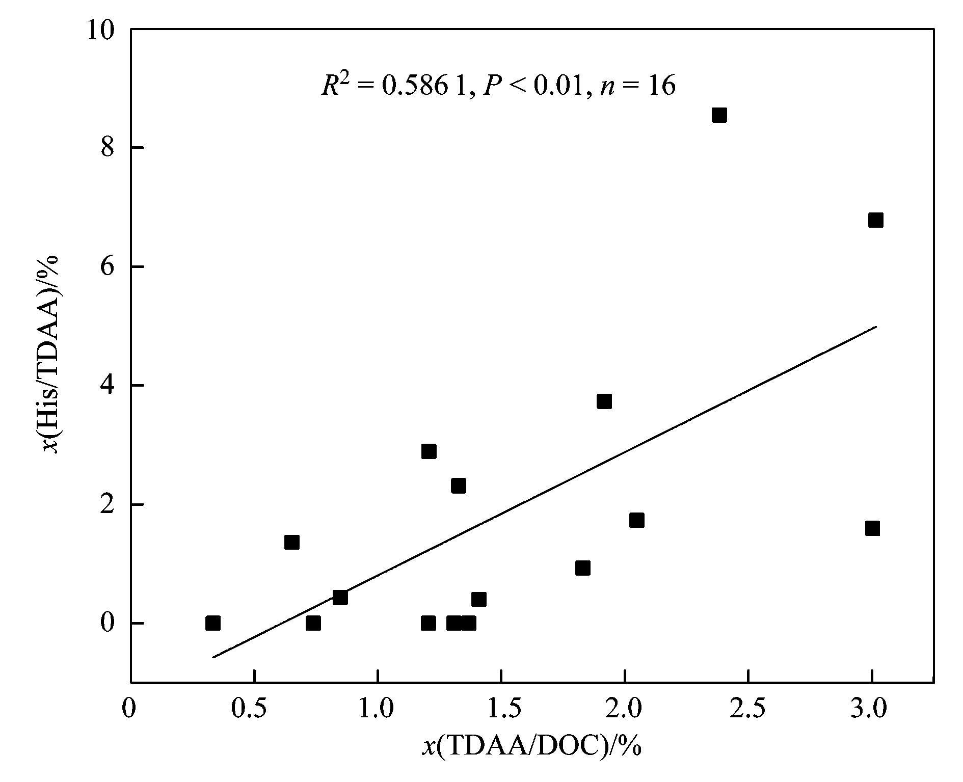 水體中氨基酸的構成和相對豐度與不同種類氨基酸的生物可利用性有關,因此,氨基酸的組成可以粗略指示有機質的降解程度[33, 34]. 環膠州灣各污水處理廠排放口中Gly含量最高,這可能是由于微生物細胞壁中富含Gly[35],相對于細胞質中的氨基酸,Gly較難被生物降解,因此,隨著DOM生物降解程度的加重,Gly相對豐度會進一步增大[34, 36, 37]. 比如,海泊河污水處理廠3月TDN較高(圖 2),DOC/DON值較低(圖 3),Gly含量較低,表明其DOM未經過深度生物降解; 而7月該污水處理廠TDN含量較3月顯著降低,DOC/DON值和Gly含量則較3月顯著増高,表明7月該排放口污水中DOM發生明顯的生物降解. 另外,作為TDAA的重要組成部分,組氨酸(His)富含于微生物細胞質中[35],較其他種類氨基酸易于降解,因而His含量隨DOM生物降解加劇和生物可利用性減小而減小. 進一步發現表明His/TDAA與TDAA/DOC呈正相關(n=16,R2=0.586 1,P<0.01,圖 6),表明His/TDAA與TDAA/DOC一樣,可作為DOM生物可利用性潛力的指標. 這與Zhang等[38]應用氨基酸構成和豐度對長江口及其鄰近海域DOM生物可利用性的研究結果基本一致.具體參見污水寶商城資料或http://www.xhxdt.com更多相關技術文檔。