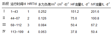 人工濕地進水取自某水產養殖場的生產河道,進水水質如表 1所示.兩個裝置并聯運行,進水量由蠕動泵控制,全天24 h連續運行.在人工濕地系統穩定運行之后于2014年3月~9月進行試驗,初設的水力停留時間為1 d,然后通過進水量的改變控制水力停留時間和水力負荷,根據不同的工況可將試驗分為4個階段,各階段的運行參數如表 2所示,每階段進行試驗前均設有5~8 d的過渡期以確保人工濕地穩定運行.