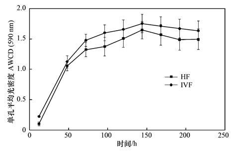 AWCD值反映了微生物群落對不同碳源代謝的總體情況,其變化速率反映了微生物的代謝活性.水平潛流人工濕地上層前部與復合垂直流人工濕地上層基質不同時間的AWCD值如圖 4所示.在這兩個不同構型的人工濕地中,復合垂直流對碳源的利用程度高于水平潛流,微生物群落代謝功能的差異可能與不同構型濕地中溶解氧濃度和污染物內部降解規律有關.