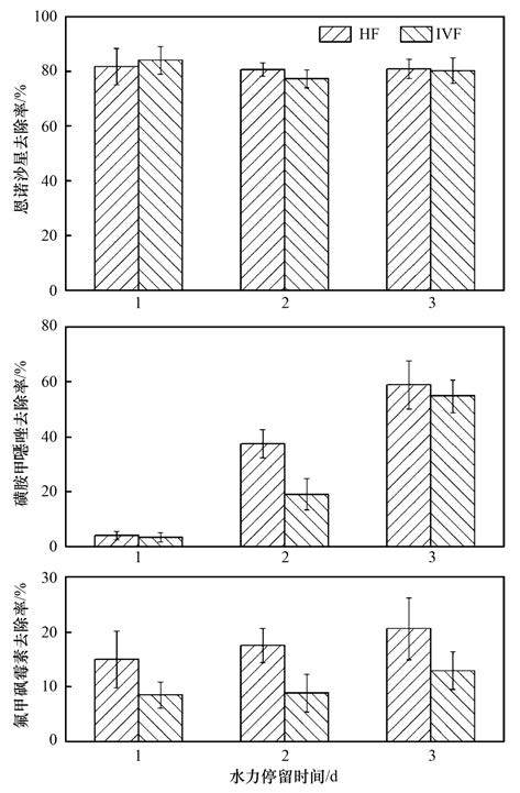 兩個人工濕地對抗生素去除效果如圖 7所示,從中可知水產養殖廢水進水中恩諾沙星、磺胺甲 唑和氟甲砜霉素的平均濃度分別為75.36、98.07和556.48 ng ·L-1,其中氟甲砜霉素的濃度明顯高于其他兩種抗生素.人工濕地構型對抗生素的去除效果相差不大,但不同抗生素的去除效果存在一定的差異:恩諾沙星的去除率明顯大于磺胺甲 唑和氟甲砜霉素,氟甲砜霉素的去除效果最差.水力停留時間對恩諾沙星和氟甲砜霉素的去除無顯著影響(P >0.05),而對磺胺甲 唑的影響顯著(P <0.05),磺胺甲 唑的去除率隨著水力停留時間的增加有明顯的升高,水平潛流人工濕地的去除率從4%升到59%,復合垂直流人工濕地從3%升到55%.