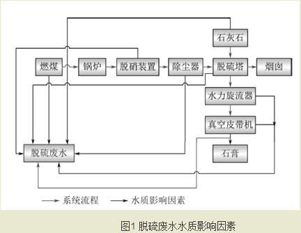 脫硫廢水的水質及水量主要受燃煤品質、石灰石品質、脫硫系統的設計及運行、脫硫塔前污染物控制設備以及脫水設備等的影響。圖1是影響脫硫廢水水質主要影響因素的關系圖。
