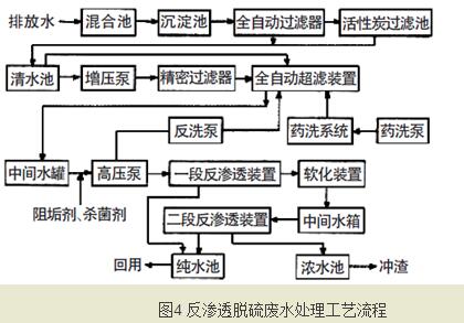 由于脫硫廢水“零排放”對水鹽分離程度要求很高,通常采用多重反滲透過濾工藝。反滲透工藝首先需要經過預處理,其工藝流程如圖4所示。