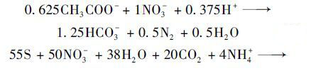 生物反硝化一直被認為是最經濟有效的脫氮方式. 但是反硝化過程中需要有機物作為反硝化碳源[7],同時存在堿度產量和污泥產量高的缺陷[8][如計量式(1) ]. 將其運用于高濃度NO3--N廢水時,這些問題尤為突出. 針對異養反硝化過程中存在的問題,很多研究者探索自養反硝化途徑,其中以單質硫作為電子受體的硫自養反硝化[如計量式(2) ]因操作簡便受到研究者的青睞,并將其運用于低NO3-濃度的地下水處理[9, 10]. 與異養反硝化相比,處理成本與污泥產量大幅降低,還減少溫室氣體的排放. 但是硫自養反硝化過程也存在需要大量堿維持反硝化系統的pH平衡以及產生NO3-污染物的缺陷.