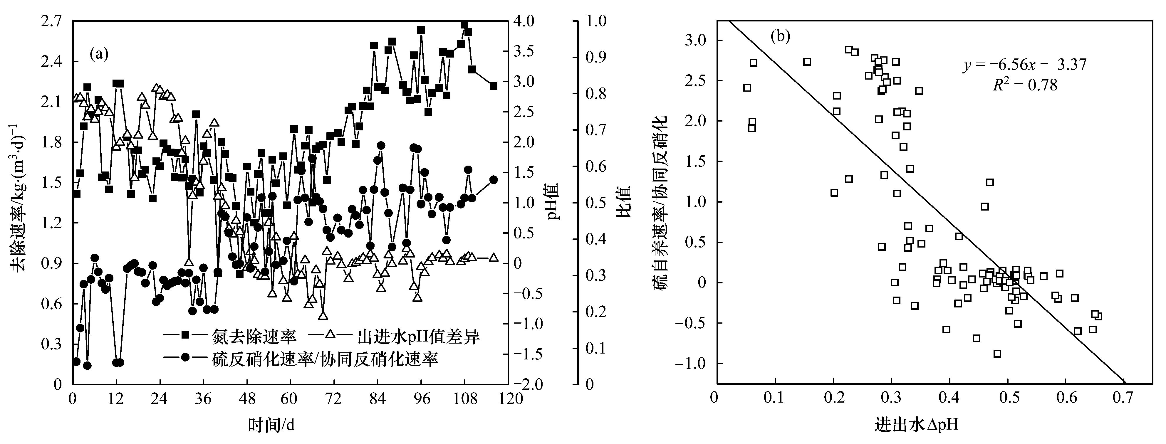 在反應器啟動初期,異養反硝化的氮去除速率約1.4 kg·(m3·d)-1左右. 在有機物不充足的情況下,硫自養反硝化反應逐步增強,反應器的整體脫氮效能不斷升高,經過116 d的運行反應器脫氮效能最高達到2.67 kg·(m3·d)-1左右. 此時硫自養反硝化與協同反硝化的比值基本穩定在0.5-0.6左右. 由圖 3(a)可知,反應器運行過程中進出水差值的變化趨勢與自養、 異養的比值具有負相關. 因此將進出水的pH差值與協同反硝化比值進行作圖后發現其具有明顯的線性關系y=-6.56x-3.37[R2=0.78,圖 3(b)]. 其相關度略微有點差,可能是異養反硝化過程中有少量無機碳溶解于液體中影響pH平衡所致.