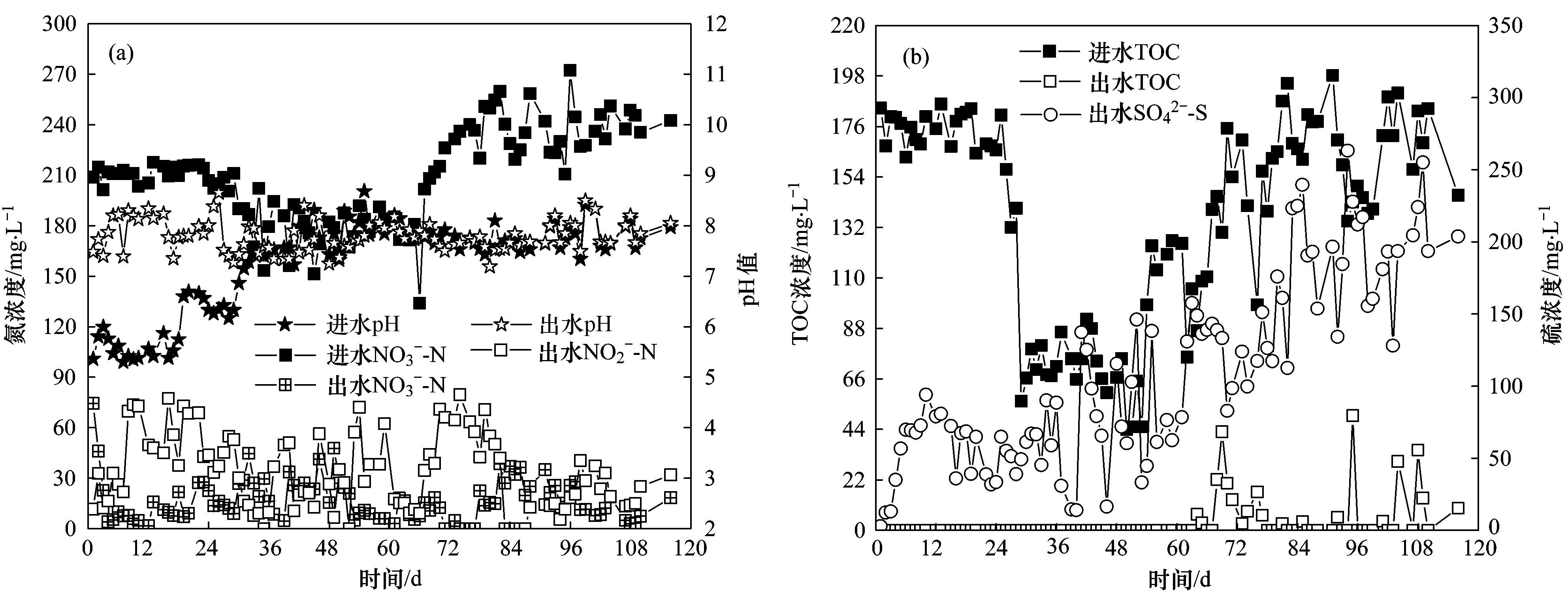 設定進水NO3--N濃度210mg·L-1左右,并向水中添加單質硫10 g,初期設定進水有機物濃度(以TOC計)180 mg·L-1左右(TOC/N比值0.86) ,而后逐步降低進水TOC/N比值,出水水質變化如圖 2所示. 經過54 d的運行,進水TOC/N比值下降到0.3左右(此時NO3--N濃度180 mg·L-1左右). 在保持出水pH值維持在7.5左右的情況下,進水pH值由最初的5.05上升到7.5左右. 此時出水NO3--N大幅降低,由初期的74.43 mg·L-1逐步下降并穩定在20 mg·L-1左右[圖 2(a)]. 同時出水SO42--S的濃度開始逐步升高,最高達到104.13 mg·L-1. 而出水有機物基本被消耗殆盡,未檢測出有機物的存在[圖 2(b)]. 說明有機物作為電子供體的競爭性要明顯強于單質硫,伴隨著有機物的耗盡,硫自養反硝化菌逐步增長. 但是在反應器運行的0-55 d內一直出現NO2--N積累,最高上升到73.96 mg·L-1. 付昆明等[15]研究表明,在異養反硝化過程中高濃度的NO3-易抑制亞硝酸鹽還原酶的活性,導致硝酸鹽還原速率大于亞硝酸鹽還原速率. Sahinkaya等[16]研究表明隨著NO3--N濃度的提高,NO2--N也會積累,并且在較長時間內難以降低. 因此本實驗中出現的NO2--N可能是進水NO3--N過高所致.