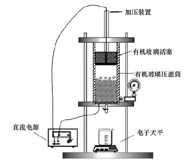 壓力垂直電場脫水裝置如圖 2所示,主要包括有機玻璃壓濾筒(內徑=70 mm)、 連接導線的有機玻璃活塞(直徑=70 mm)、 直流電源(DH1719A-4,中國大華),電子天平及配套實時監測質量的軟件(PL2002-IC,Mettler Toledo公司,瑞士).