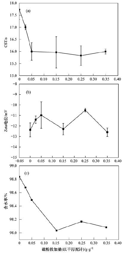 圖 3為微米磁粉投加量對污泥Zeta電位,CST值以及含水率的影響曲線. 如圖 3(a)所示,原始污泥Zeta電位值為-12.37 mV±0.89 mV,隨著磁粉投加量不斷增加,污泥Zeta電位不斷波動,這與周正等[25]研究的宏觀磁場對污泥Zeta電位的影響一致. 圖 3(b)中,磁粉投加量在0-0.05g ·g-1范圍內,CST值迅速減小,此后增大投加量對CST值影響不大,其值在16 s附近波動. 調理污泥靜沉30 min后其含水率隨著投加量增加而不斷減小,當投加量為0.15 g ·g-1時含水率達到最低值98.04%. 結合上述結果,確定較為合適的磁粉投加量為0.15 g ·g-1.