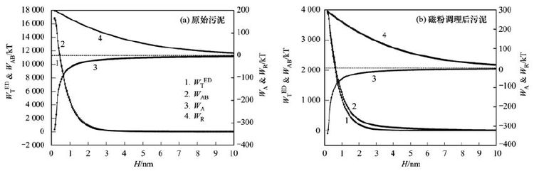 對比調理前后污泥的接觸能曲線,在0.157-10 nm的范圍內,調理后污泥的酸堿作用能WAB下降,范德華力作用能WA與靜電力作用能WR數值均沒有發生較大變化,總接觸能WTED顯著減小. 這說明磁粉對污泥的調理過程中,絮凝機制的作用極小,污泥脫水性能得到提高的主要原因在于微米磁粉大大降低了污泥顆粒間的路易斯酸堿作用.
