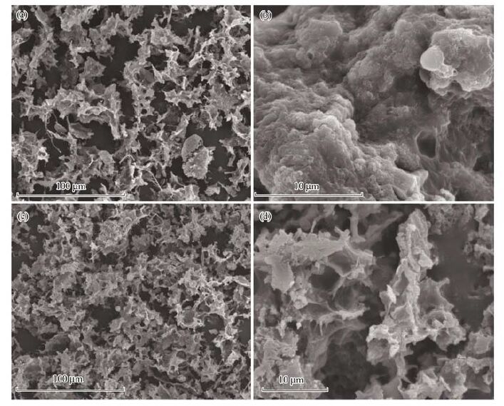 (a)和(b)為原始污泥; (c)和(d)為磁粉調理后污泥 圖 4 污泥SEM圖像