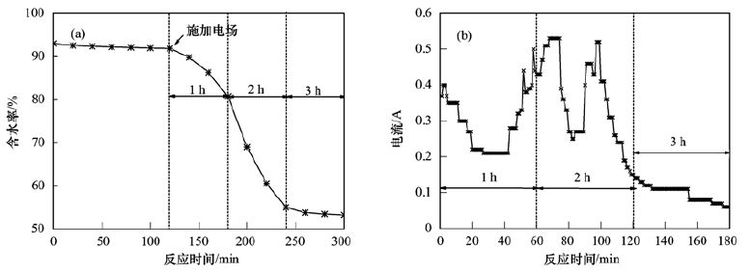 圖 6為復合脫水時間對脫水效果和電流的影響. 如圖 6(a)所示,復合脫水1 h后污泥含水率從91.87%降低至80.75%,2 h后為55.04%,3 h后為53.27%,Saveyn等[28]指出,污泥電脫水的效果極大程度上依賴于電場施加的時間段,其持續時間不宜過長也不宜過短. 電場作用時間太短通常無法達到滿意的脫水效果[29, 30],太長則脫水能耗較高[31, 32]. 根據含水率下降的幅度大小可知復合脫水時間控制在2h較合理. 圖 6(b)顯示電流脫水效率較高的時間段是40-60 min以及90-120 min,圖 6(a)確定的2 h的復合脫水時間正好處于上述時間段.